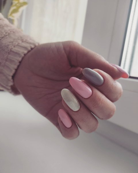 Чтобы на коротких ноготках такой маникюр смотрелся эффектно, следует выбирать яркие оттенки вроде бирюзового, охры, розового. Они визуально сделают ногти и пальцы в целом чуть длиннее. Акценты, если такие будут, тоже должны быть не менее заметными – блестки, рисунки или контрастное покрытие одного-двух ногтей лаком цвета золота или металлик.