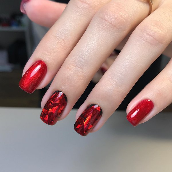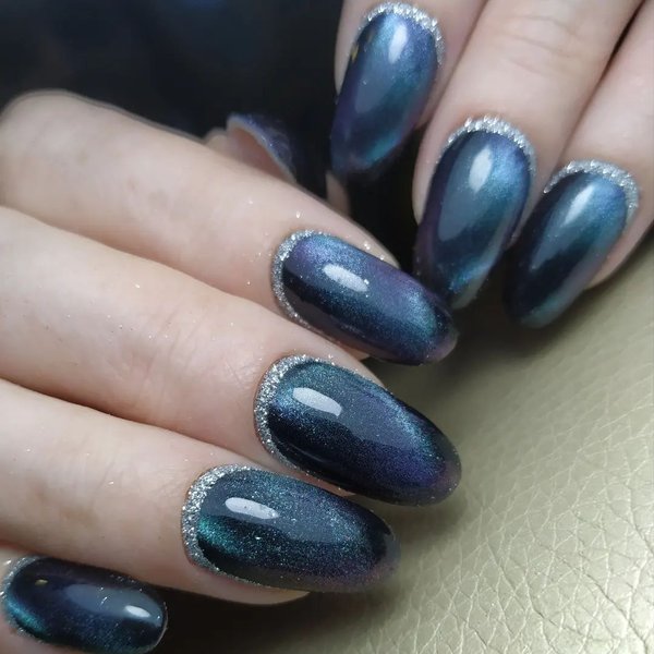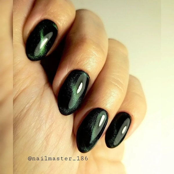 Благодаря глубине цвета и блеску такой маникюр не нуждается в дополнительном декоре. Еще одно его существенное преимущество состоит в том, что он подходит на любую длину ногтей. "Кошачий глаз" одинаково уместен как для делового образа, так и для вечеринки, добавив на безымянные пальцы бархатный песок, стразы или рисунки на контрастном покрытии.