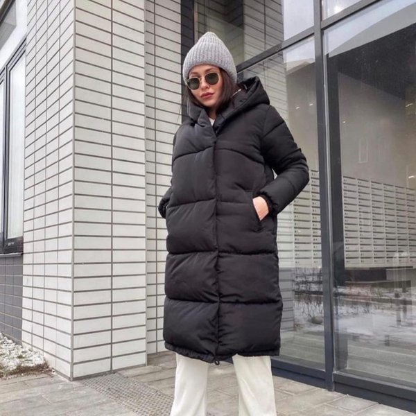 Эта модель не только универсальная, но и очень практичная, поскольку позволяет защитить максимум тела от холода и пронзительного ветра. Лучше всего он будет смотреться с базовыми джинсами или спортивными костюмами и массивными ботинками. Верх тот же, что и в случае с короткими пуховиками – водолазки, свитшоты, толстовки. Особенно эффектно многослойность будет выглядеть, если вы наденете пуховик оверсайз.