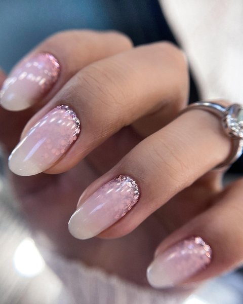 Также в последнее время популярен градиентный маникюр с бесцветным лаком, вторым цветом к которому идет что-то более яркое или темное, или вообще растянутый глиттер.
