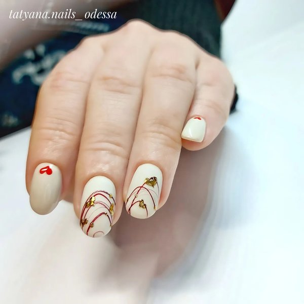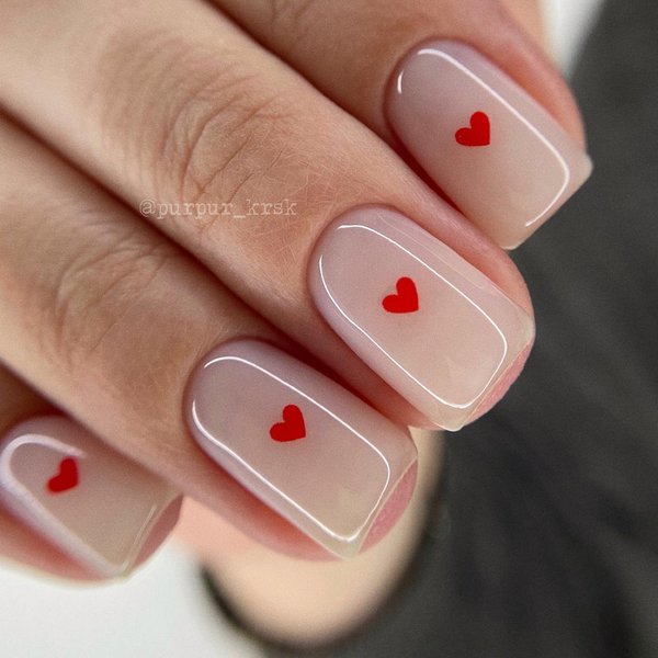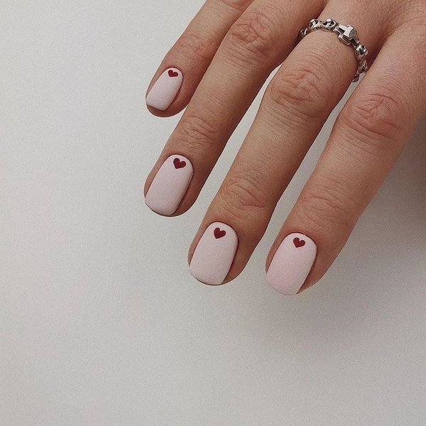 Не все могут похвастаться длинными ногтями идеальной формы, однако это не повод расстраиваться. Покрытие в нюдовых и светлых тонах с сердечками, нарисованными с помощью тонкой кисточки или наклеенными, станут отличным решением для "валентиновского" маникюра.
