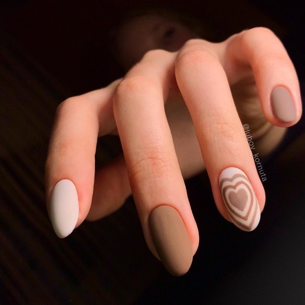 Кроме традиционного красного или розового базового покрытия, прекрасно подходят для "валентиновской" тематики и другие цвета. Особое внимание стоит обратить на акцентный маникюр, когда один или несколько ногтей в тематических рисунках или контрастного цвета.