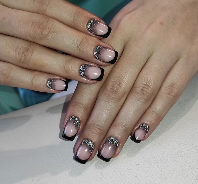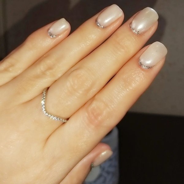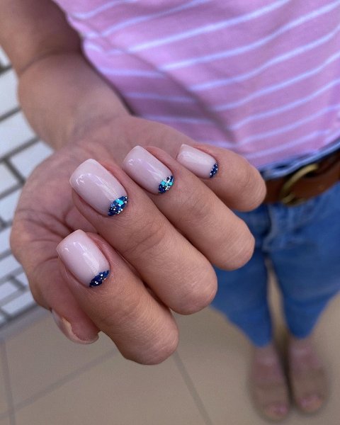 Роскоши лунному френчу придаст дуга, сделанная из маленьких стразов. Чем они меньше. тем аккуратнее и не кричаще будет смотреться подобный дизайн. Он хорошо подойдет для вечеринок, хотя и для повседневной носки весьма неплох. Аналогичный эффект можно получить, используя блестки.
