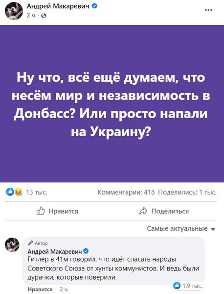 "Ну что, все еще думаем, что несем мир и независимость в Донбасс? Или просто напали на Украину?", а в комментариях напомнил, что Гитлер в 1941 году говорил, что идет спасать народы Советского Союза от хунты коммунистов.