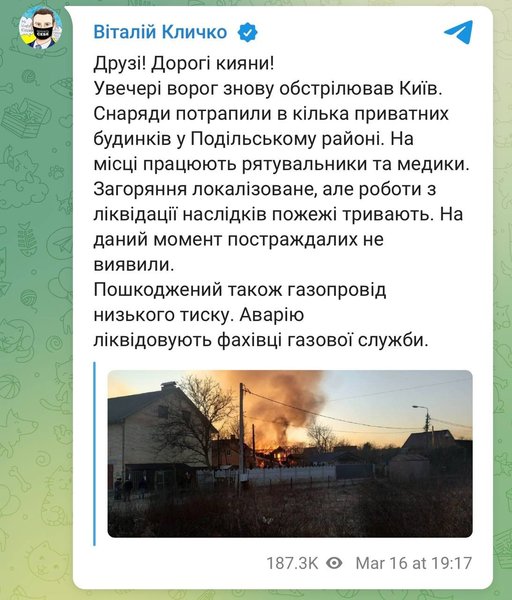 "Ни дома, ни офиса больше нет! Все живы! Что ж, будем отстраиваться заново!…", – подписал он снимки, на которых видны разрушения, а также работа спасателей. Сотрудники ГСЧС пытаются потушить пожар, охвативший территорию и здания после попадания снаряда.