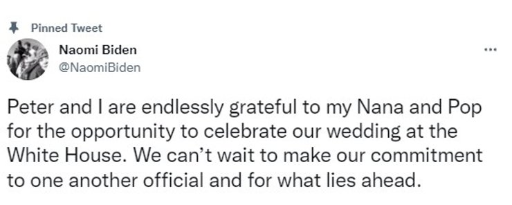 "Мы с Питером бесконечно благодарны моим Нане и Попу (Джилл и Джон Байдены) за возможность отпраздновать нашу свадьбу в Белом доме. Нам не терпится официально заявить о наших обязательствах друг перед другом и за то, что нас ждет впереди", – говорится в публикации.
