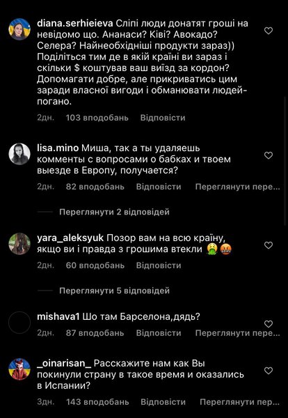 "Чеки на расходы будут?", "За эти деньги и бежал из страны", "Как ты уехал во время военного положения в стране?" и тому подобное. Также фолловеры Кацурина спросили, где же Надя и правда ли, что они вместе в Барселоне.