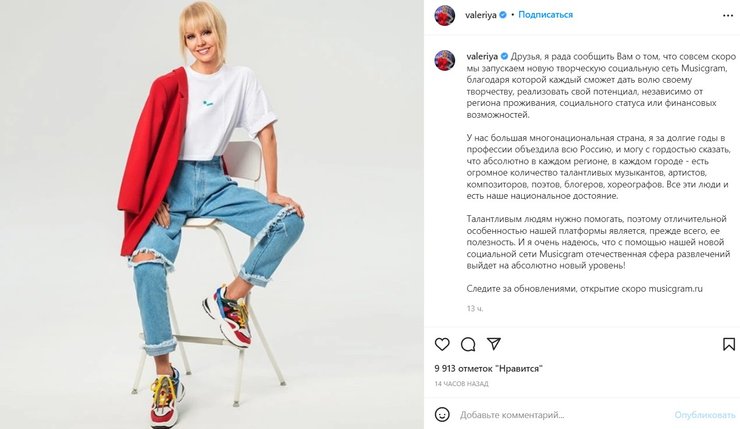 В комментариях многие поддержали инициативу, однако были и те, кто напомнил Валерии о войне в Украине, а также высмеял название социальной сети, которое созвучно с американским сервисом Musicgram.