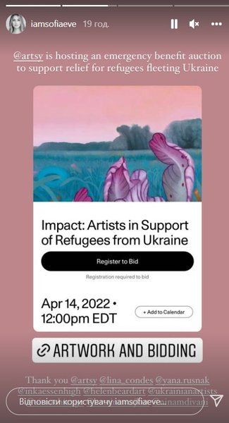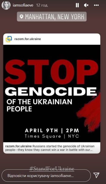 В сториз девушка зовет подписчиков выйти на Манхэттен 9 апреля на акцию против геноцида украинского народа, а также продвигает сервисы, помогающие беженцам.