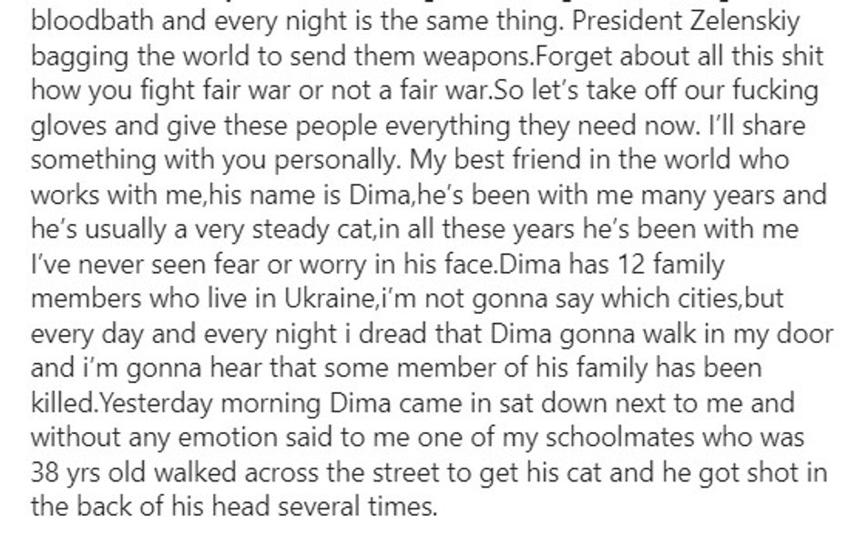 "Обычно он очень уравновешенный. За все эти годы, что он был со мной, я никогда не видел страха или беспокойства на его лице. У Димы 12 членов семьи, которые живут в Украине, я не буду говорить, в каких городах, но каждый день и каждую ночь я боюсь, что Дима войдет в мою дверь, и я услышу, что кого-то из его семьи убили. Вчера утром зашел Дима, сел рядом и без каких-либо эмоций сказал мне, что один из его одноклассников, 38 лет, шел через улицу за своим котом, и ему несколько раз выстрелили в затылок".