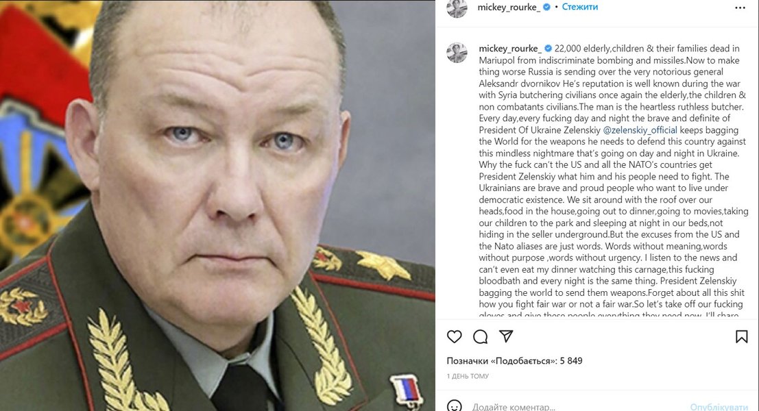 Микки Рурк назвал путинского генерала, посланного в Украину, безжалостным мясником