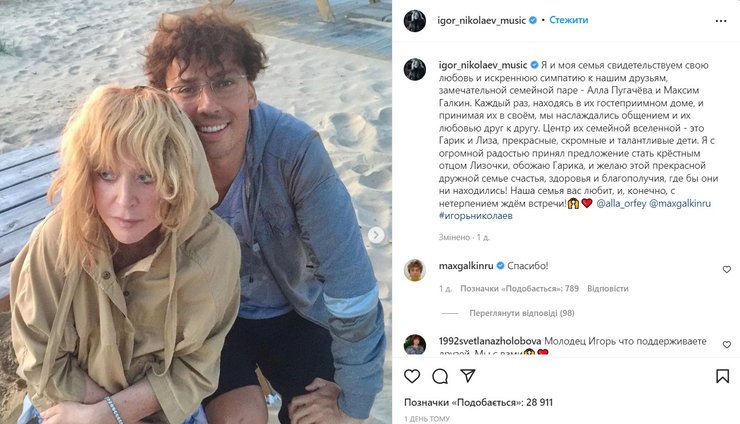 "Я и моя семья свидетельствуем свою любовь и искреннюю симпатию к нашим друзьям, замечательной семейной паре — Алла Пугачева и Максим Галкин. Каждый раз, находясь в их гостеприимном доме, и принимая их в своем, мы наслаждались общением и их любовью друг к другу. Центр их семейной вселенной — это Гарик и Лиза, прекрасные, скромные и талантливые дети. Я с огромной радостью принял предложение стать крестным отцом Лизочки, обожаю Гарика, и желаю этой прекрасной дружной семье счастья, здоровья и благополучия, где бы они ни находились! Наша семья вас любит, и, конечно, с нетерпением ждем встречи!", – написал он в соцсети. На публикацию отреагировал Галкин, поблагодарив артиста.