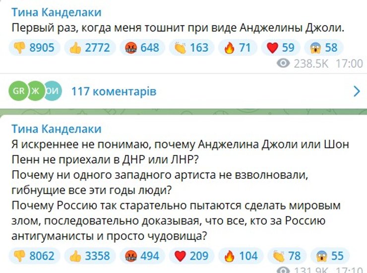 Телеведущая Тина Канделаки призналась, что ее от Джоли "теперь тошнит".
