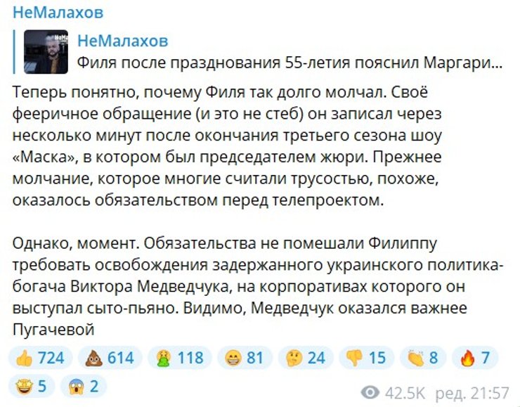 Как предполагает telegram-канал "НеМалахов", певец не зря молчал несколько дней. Обращение он записал несколько минут после окончания третьего сезона шоу "Маска", где возглавлял жюри.