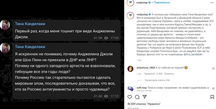 "А сколько раз побывала сама Тина Канделаки там? Вот я например был в Луганской и Донецкой области два раза, конечно, на стороне Украины, света и любви, поддерживая ЗСУ концертами, как и мои коллеги Кароль, Таяна, Мирзоян и тд… А мы, кроме Пореченкова, который приехал пострелять в украинцев, тебя, Канделаки, не помним. Не удивляйтесь, в отличии от рашки, где артисты – челядь и тля, во всем цивилизованном мире Артисты, Звезды, Селебрити – это вестники свободы, прав человека и активные социальные деятели! Так что ждите на нетфликсе фильм про борьбу Украины с Робертом Де Ниро в роли полковника ВСУ, а тебя, Канделаки, сыграет Пенелопа Крус, но не радуйся там, где ты будешь, фильм этот ты не подкачаешь", – написал он.