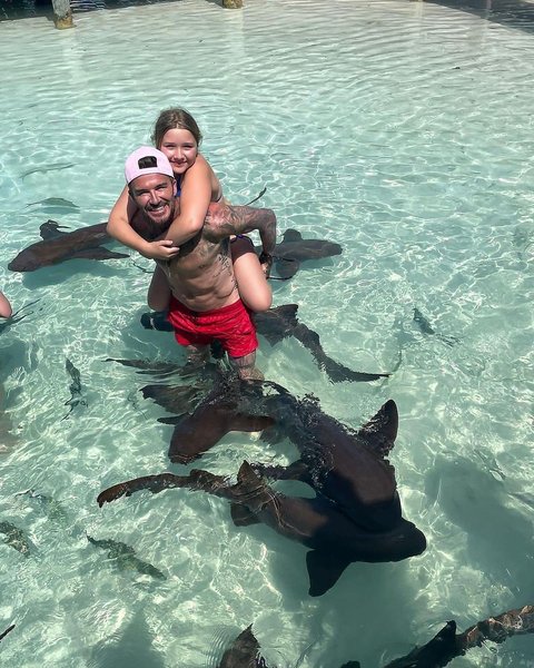 Судя по снимкам, семья Бэкхемов отпраздновала день рождения знаменитости на яхте, после чего отправилась в контактный зоопарк, где порезвилась с акулами, а после встретили закат на морском берегу.