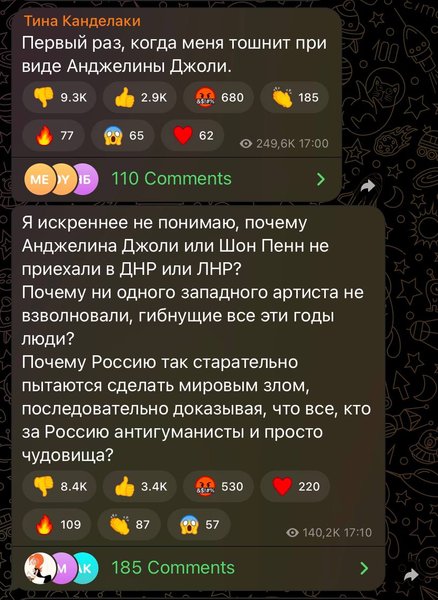 Среди известных россиян выделилась российская телеведущая Тина Канделаки, заявившая, что ее "тошнит от Анджелины Джоли". Российская знаменитость "искренне не понимает, почему Джоли и Шон Пенн не приехали в ДНР и ЛНР".