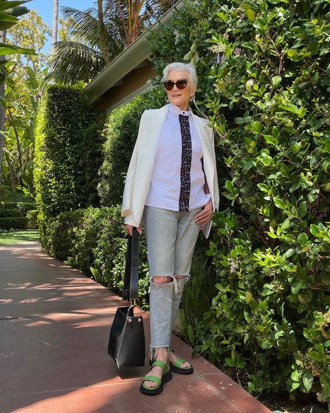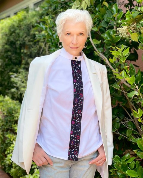 Мэй Маск сочетала вышиванку с рваными джинсами.