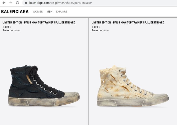 Так что если вам лень разнашивать новую обувь, как пошутили в издании Нighsnobiety, на Balenciaga доступна ограниченная серия из 100 сильно изношенных кроссовок.