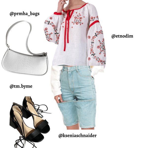 Яркая вышитая рубашка с пышными рукавами сочетается с дерзкими шортами, трендовыми босоножками и сумкой-багетом. Аксессуары можно добавлять по вкусу. Например, кольца из бусин или массивные серьги.