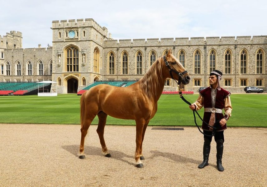 Королева приняла делегацию во главе с президентом Федерации конного спорта Азербайджана Эльчином Гулиевым в Виндзорском дворце в рамках традиционного Королевского Виндзорского конного шоу, которое проходит в Великобритании с 12 по 15 мая 2022 года.
