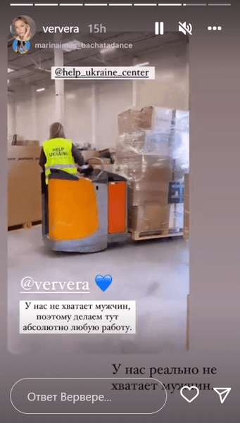 Певица Вера Брежнева на днях прилетела из Италии в Польшу, чтобы помочь с гуманитарной помощью для украинцев. Артистка опубликовала у себя в Instagram сторис, где она разгружает фуру в Люблине. Знаменитость была одета в яркий спецжилет и спортивные штаны. Певица написала, что в центре гуманитарной помощи не хватает волонтеров, особенно мужчин, поэтому женщины выполняют всю работу сами.