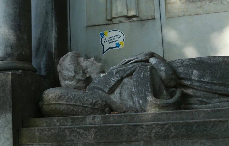 Наклейки с украинской символикой и призывом поддержать украинского президента оказались на надгробиях известных исторических личностей.