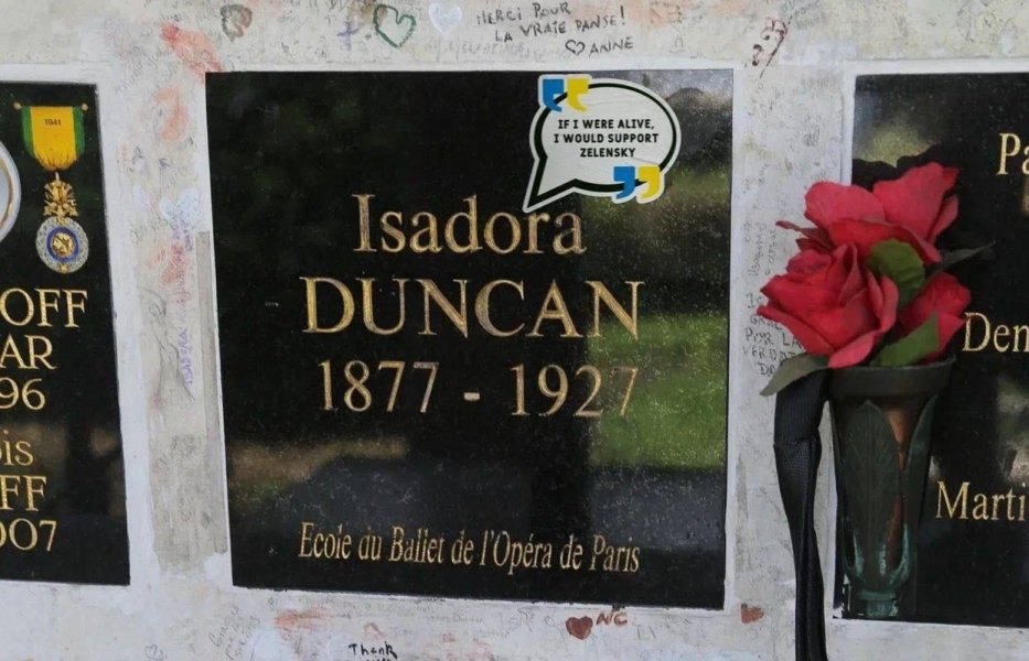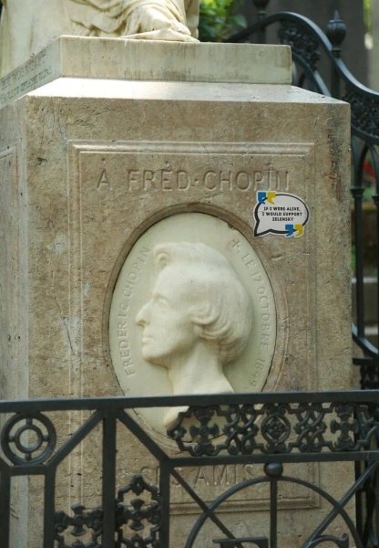 На стикерах написано: "Если бы я был жив – я бы поддержал Зеленского". Надпись сделана на английском, видимо, с расчетом на многочисленных туристов со всего мира, которые посещают самое известное кладбище в Париже.