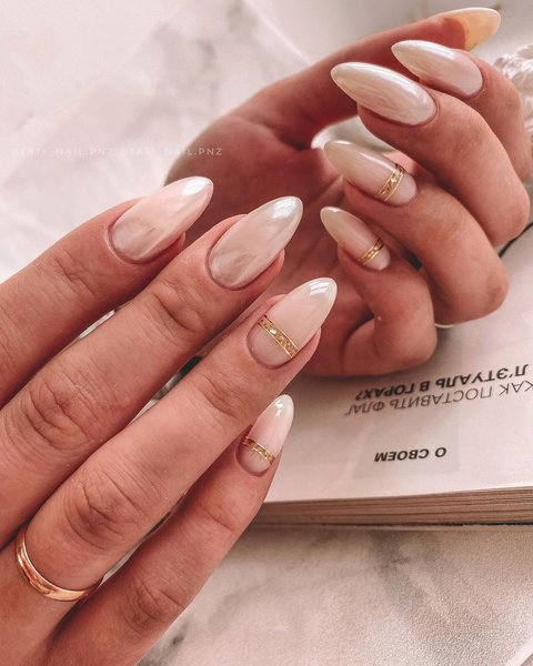 Такая идея дизайна отлично подойдет для тех невест, кто готов поэкспериментировать, при этом хотят сохранить элегантность образа. Аккуратные золотые акценты добавят маникюру изящности и будут удачно гармонировать с обручальными кольцами.