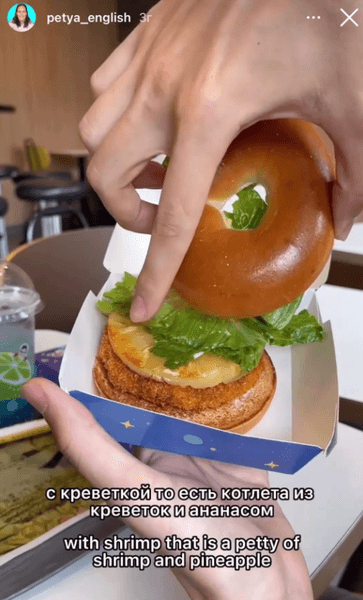 Среди непривычных позиций был бургер с котлетой из креветок, ананасом гриль, зеленым салатом и лимонным соусом — немного похоже на версию Филе-о-Фиш, только для гурманов, — с булочкой в форме бейгла.