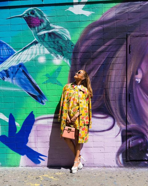 Так, по улицам Нижнего Ист-Сайда в Нью-Йорке поп-дива прогулялась в в желто-розовом мини-платье с цветочным принтом и такой же расцветки пальто до колена, которые для нее подобрали команда ее стилисты Роб Зангарди и Мариэль Хаэнн. Образ она дополнила розовой сумочкой Ferragamo, белыми туфлями на высоком каблуке и платформе и большими солнцезащитными очками. В качестве аксессуаров Лопес выбрала золотые серьги-кольца.