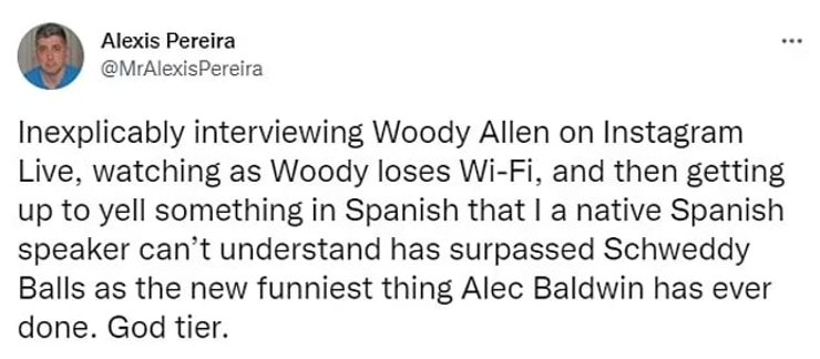 "Необъяснимым образом взять интервью у Вуди Аллена в Instagram Live, посмотреть, как Вуди теряет Wi-Fi, а затем встать, чтобы выкрикнуть что-то по-испански, чего я, носитель испанского языка, не понимаю, превзошло Шведди Боллса как новую самую забавную вещь, которую когда-либо делал Алек Болдуин. Уровень бога".