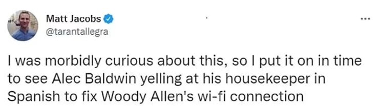 "Мне было болезненно любопытно, поэтому я включил его как раз вовремя, чтобы увидеть, как Алек Болдуин кричит на свою домработницу по-испански, чтобы она починила Wi-Fi Вуди Аллена", – написал журналист Мэтт Джейкобс.