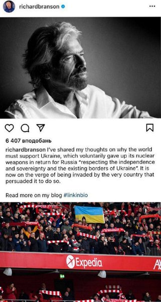 "Ричард Брэнсон постоянно выступает в поддержку Украины, ее суверенитета, территориальной целостности, а также за жесткие санкции против РФ, ее лидеров и экономики. В Гостомеле он интересовался аэродромом ГП "Антонов", возможностями его восстановления. Вместе с представителями Укроборонпром и ГП "Антонов" рассказали гостю о таких перспективах и существующих проектах реконструкции аэропорта", – написал чиновник.
