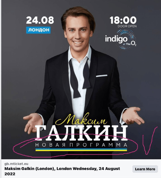 Отметим, что концерт Максима Галкина в Лондоне планируется на День независимости Украины, 24 августа 2022.