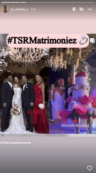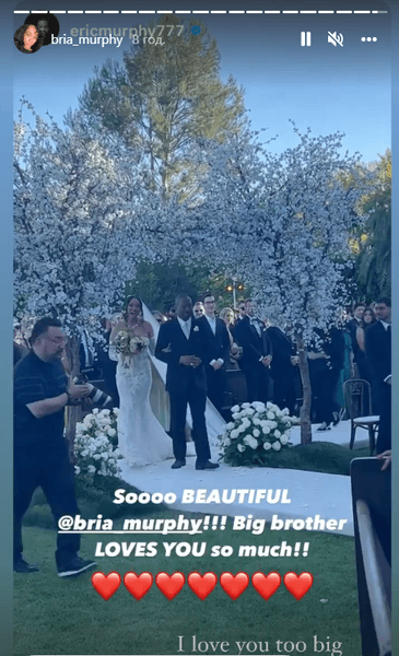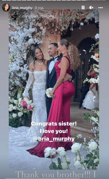 В сторис Instagram девушка поделилась кадрами со свадьбы, где видно, как отец ведет ее к алтарю. На одном из снимков молодожены позируют с родителями невесты, а на другом Бриа сидит на коленях у мужа Ксавьера.