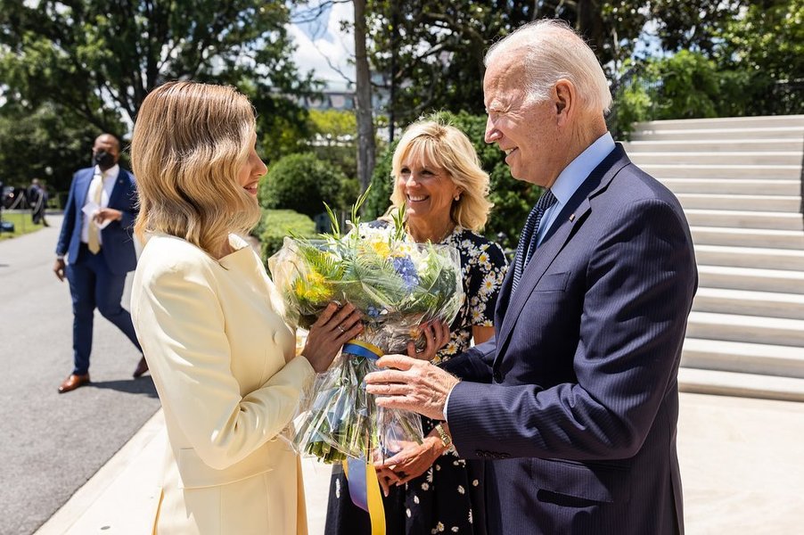 Глава Белого дома встретил супругу Владимира Зеленского с букетом подсолнечниов, перевязанных сине-желтой лентой, а Джилл Байден обняла Елену Зеленскую. У себя в Instagram первая леди Украины написала, что в США ее пригласила супруга американского президента.