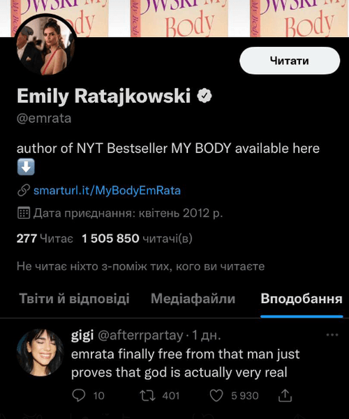 Ратаковски поставила лайк на твит неизвестной девушки, в которой она отметила: