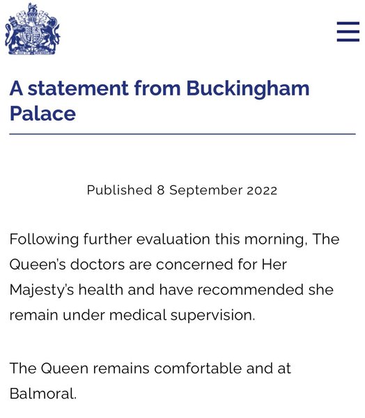 "После дальнейшего обследования этим утром врачи королевы обеспокоены состоянием здоровья Ее Величества и рекомендовали ей оставаться под медицинским наблюдением. Королева остается в комфорте и находится в Балморале".