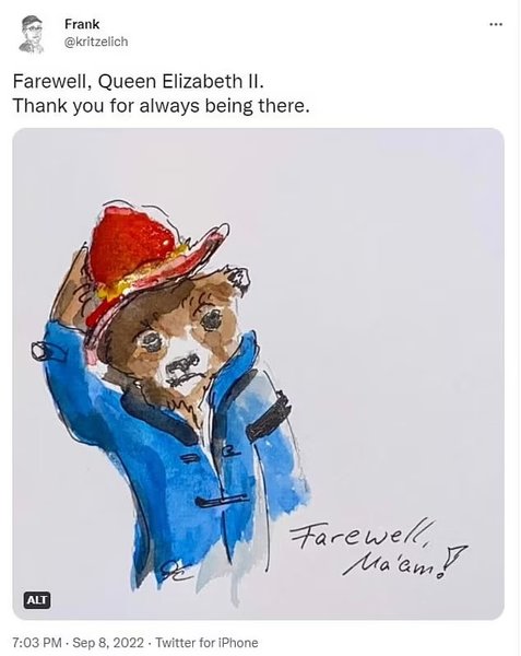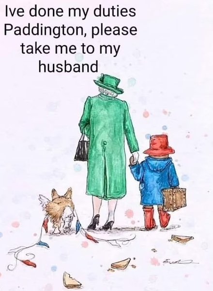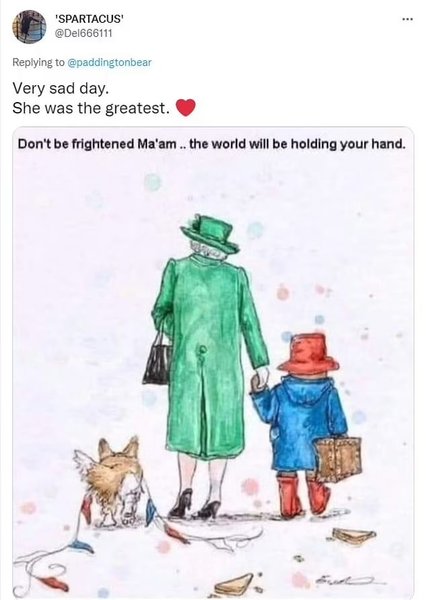 Недавно медвежонок Паддингтон трогательно простился с Ее Величеством. Повторяя свои слова в их знаменитом скетче, он сказал: "Спасибо, мэм, за все". Дополнительные мемы с медведем Паддингтоном были опубликованы в Twitter в том же тоне, и на одном из набросков медведь с уважением приподнял шляпу.