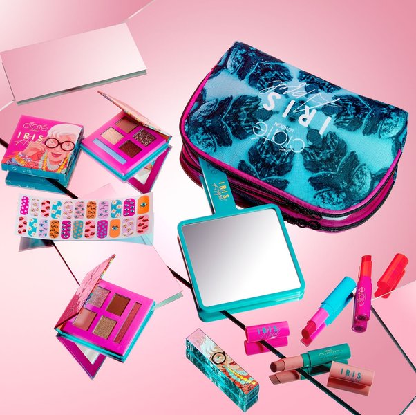 В линейку вошли восемь предметов: две палитры теней для век, три оттенка для губ, зеркало, косметичка и наклейки для ногтей. Все перечисленное украшено изображением Апфель, вплоть до ее фирменных очков в черной оправе. Даже на косметичке есть ее лицо. по словам Айрис, она не могла поверить, когда впервые увидела результат.