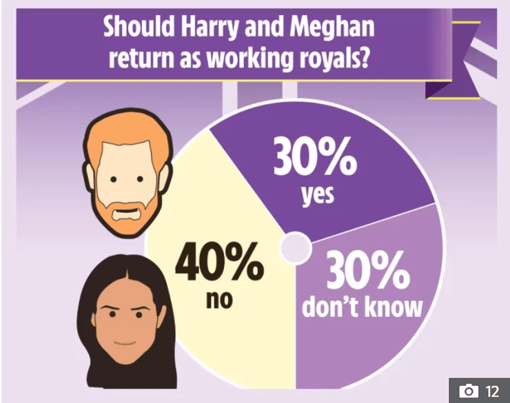 Большинство опрошенных жителей королевства заявили, что не хотели бы, чтобы герцоги Сассекские вмешивались в дела Букингемского дворца, 40% отметили, что не хотят, чтобы они возобновили исполнение королевских обязанностей.