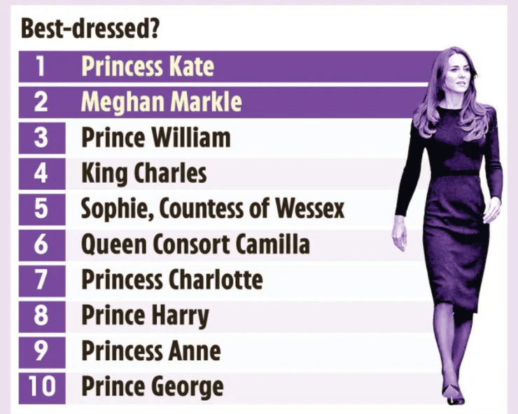 Опрос The Sun также определил наиболее стильно одетых представителей современной монархии. Первое место снова заняла принцесса Кейт Миддлтон. На втором месте – герцогиня Сассекская Меган Маркл. Третье и четвертое – принц Уэльский Уильям и король Карл III. Пятое место – Софи, графиня Уэссекская.