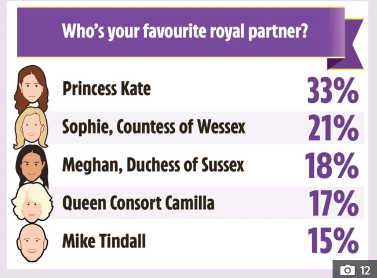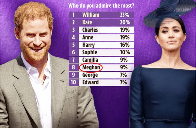 Во время опроса "Кто вам больше нравится" (из королевской семьи — ред.) за Меган Маркл отдали 9% голосов, она заняла 8-е место рейтинга после королевы-консорт Камиллы и герцогини Софи, жены принца Эдварда. После герцогини Сассекской в списке следовали принц Джордж, сын принца Уэльского Уильяма, и принц Эдвард, сын королевы Елизаветы ІІ.