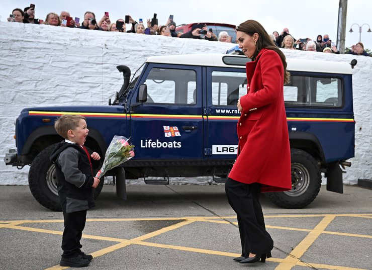 На встрече с сотрудниками спасательной станции RNL в Холихеде Кэтрин появилась в ярко-красном стильном малиновом пальто LK Bennett, украшенном золотыми пуговицами. Под него она надела легкий вязаный джемпер, черные широкие брюки с поясом и завершила образ лодочками на шпильке и маленькой черной сумочкой. В качестве аксессуара герцогиня Кембриджская и Корнуольская выбрала золотые серьги.