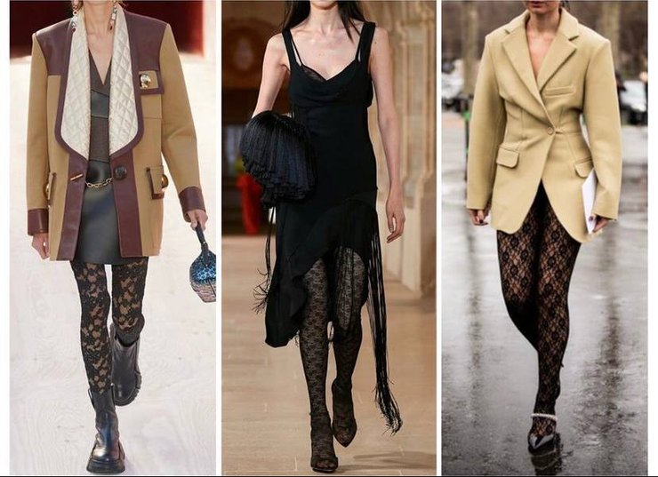 Fashion-колготки. Разбавить свой аутфит можно не только яркими элементами или аксессуарами, но и разнообразием принтов на колготах. Лучшим вариантом станет, если это будет кружево или большая сетка.