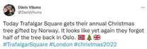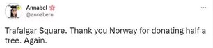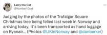 "Судя по фотографиям рождественской елки на Трафальгарской площади, срубленной на прошлой неделе в Норвегии и прибывшей сегодня, ее перевозили в ручной клади рейсом Ryanair", "Каждый год Осло отправляет рождественскую елку на Трафальгарскую площадь в благодарность за нашу помощь во время Второй мировой войны. Но я начинаю думать, что, возможно, норвежцы нас не так любят", "Сегодня Трафальгарская площадь получает свою ежегодную рождественскую елку, подаренную Норвегией. Похоже, они снова забыли половину дерева в Осло", – пишут в комментариях пользователи.
