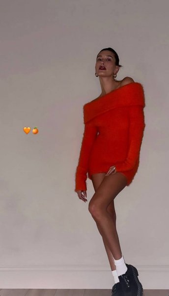 Жена Джастина Бибера примеряла экстремально короткое платье красного цвета с открытыми плечами и длинными рукавами. К образу знаменитость добавила золотистые серьги-кольца и черные лоферы с белыми носками.