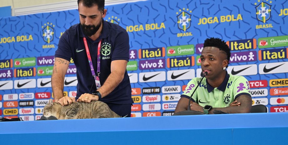 Сотрудник пресс-службы Бразилии оскандалился на Чемпионате мира по футболу после того, как грубо сбросил со стола кошку, которая забралась туда во время пресс-конференции нападающего "Реала" и сборной Бразилии, 22-летнего Винисиуса-младшего, пишет Mirror.