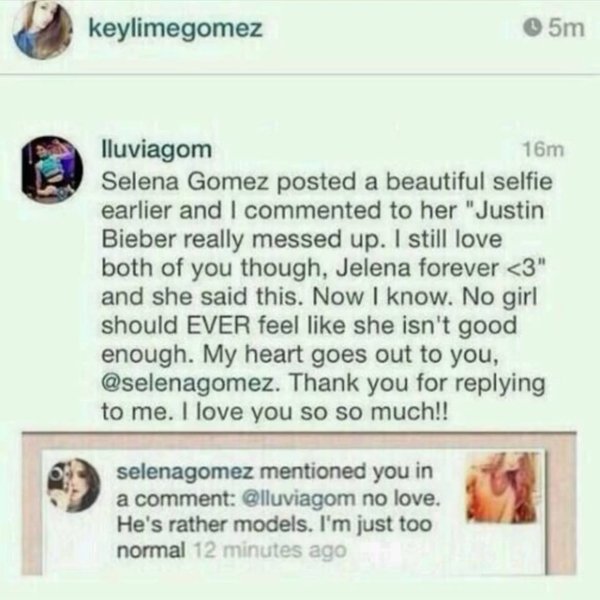 Видео заканчивается скриншотом комментария 2014 года, в котором Гомес написала, что она "слишком нормальна" для Бибера, который будет скорее встречаться с "моделями".